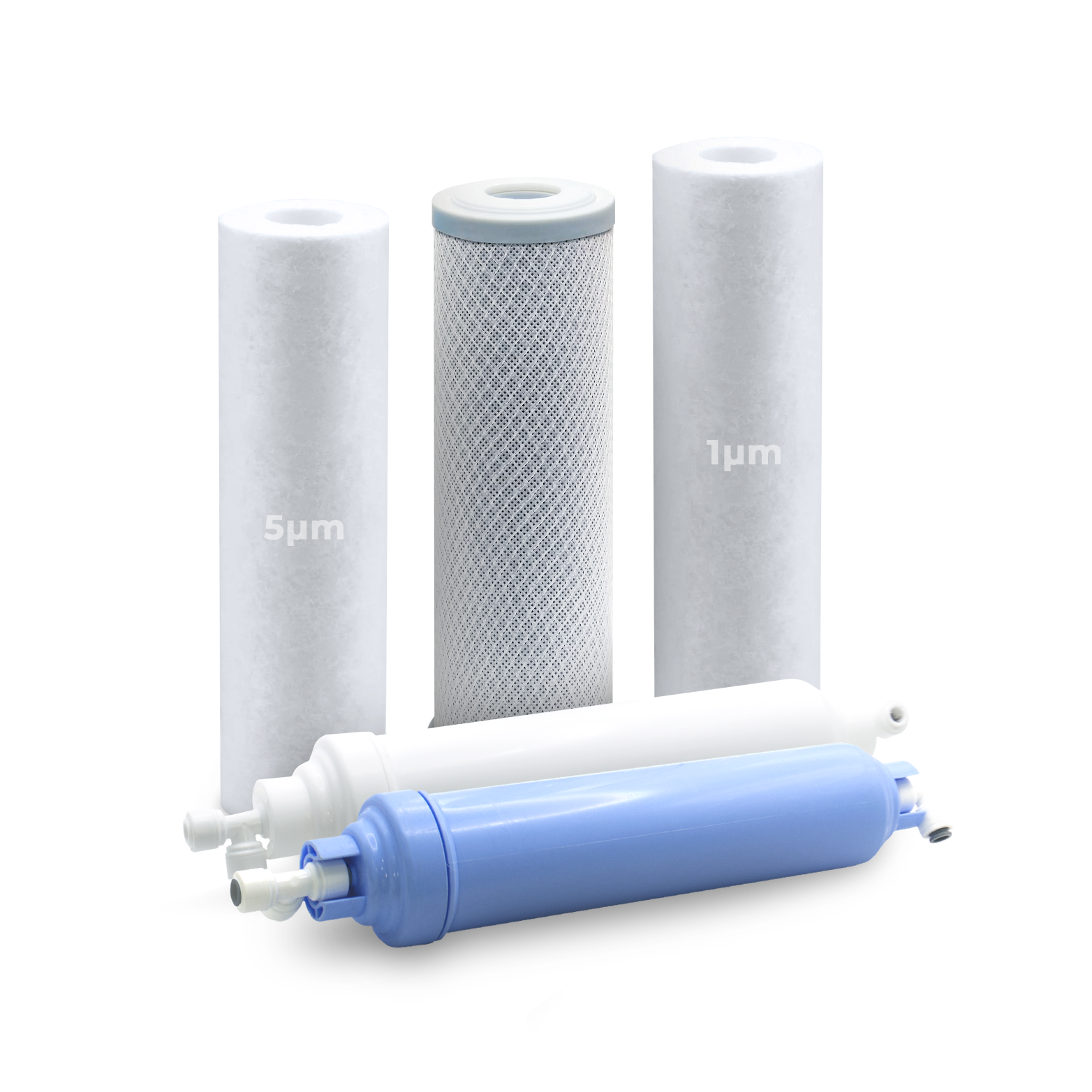Комплект картриджів передочищення з постфільтром та мінералізатором - призначений для встановлення в шостиступеневих системах зворотного осмосу. Основне призначення підготувати воду для подальшої фільтрації основним фільтруючим елементом - мембраною зворотного осмосу. Це досягається шляхом очищення води від механічних забруднень (розмір механічних домішок від 5 до 1 мкм), а також очищення від хлору, хлорорганічних зʼєднань, металів, нафтопродуктів та пестицидів. Також в цьому комплекті поставляється вугільний постфільтр та мінералізатор.