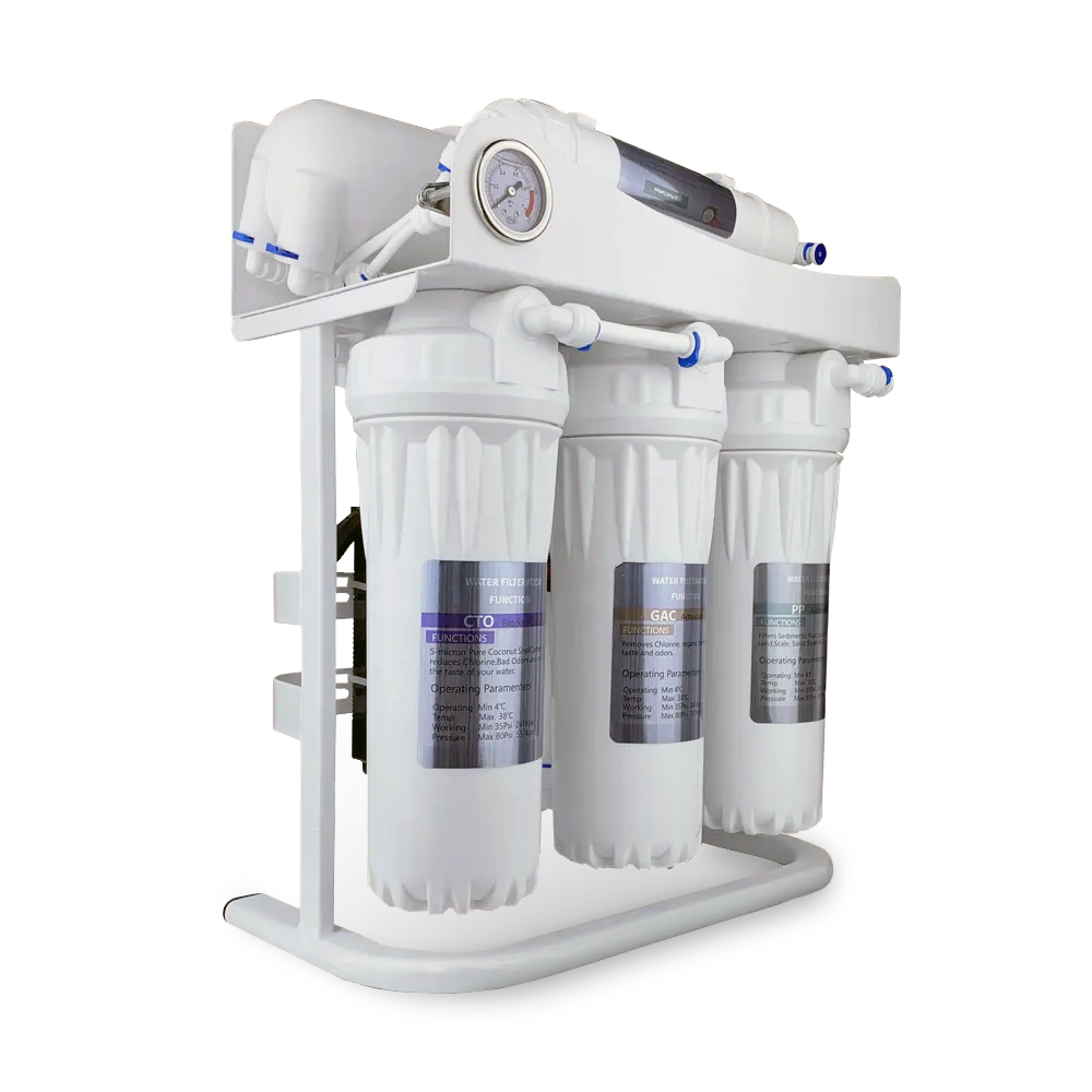- Високопродуктивна зворотноосмотична мембрана 600GPD яка на молекулярному рівні видаляє з води метали, віруси, паразити та бактерії.